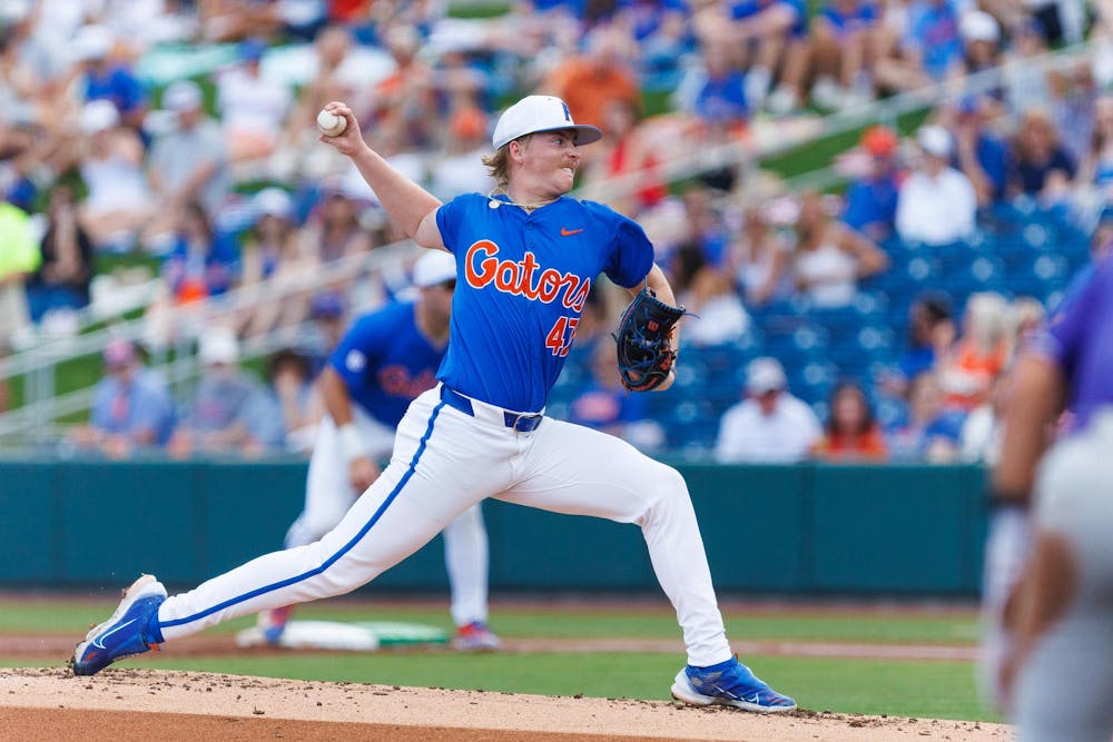 Florida Gators right handed pitcher Aidan King pitches during an NCAA Baseball game against High Point, Saturday, March 7, 2026, in Gainesville, Fla.
