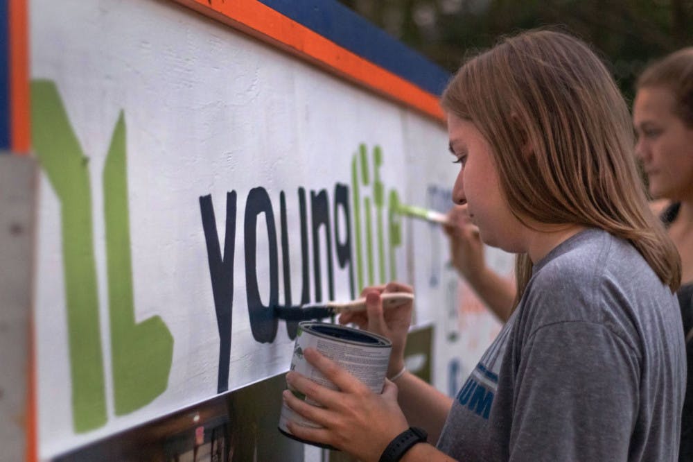Bekah Malpass, a 21-year-old UF English senior, works on the Young Life float for the homecoming parade. This is the fourth year that Young Life has participated and about 30 high school and college students are marching with the trailer in the parade.