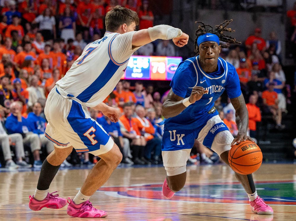 Kentucky guard Denzel Aberdeen (1) dribbles against Florida guard Urban Klavzar (7) during the second half of an NCAA college basketball game, Saturday, Feb. 14, 2026 at Exactech Arena in Gainesville, Fla.