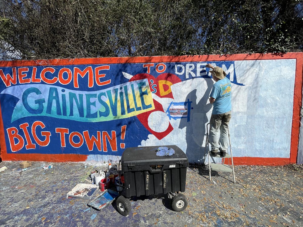 Harry D. Michael, a 72-year-old independent artist, carefully recreates a mural dedicated to Tom Petty at the 34th Street Wall in Gainesville, Fla. Monday, March 2, 2026.