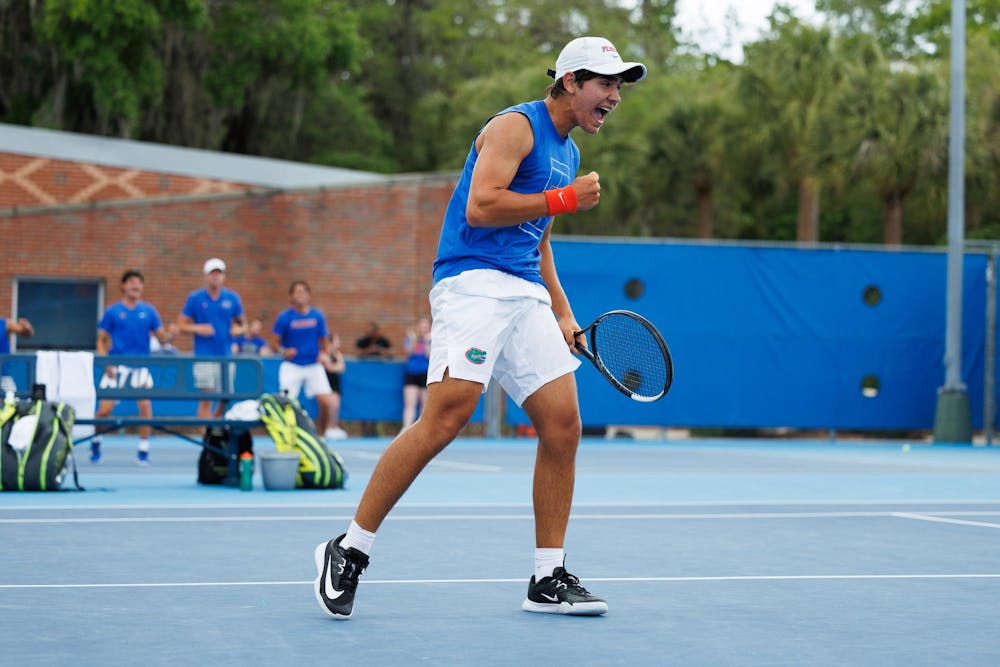 UF tennis' Henry Jefferson celebrates during his head-to-head match against South Florida's Ettore Danesi. Their match was the only one on Saturday to go to three sets, with Jefferson sealing the Gators’ victory over the Bulls Jan. 17