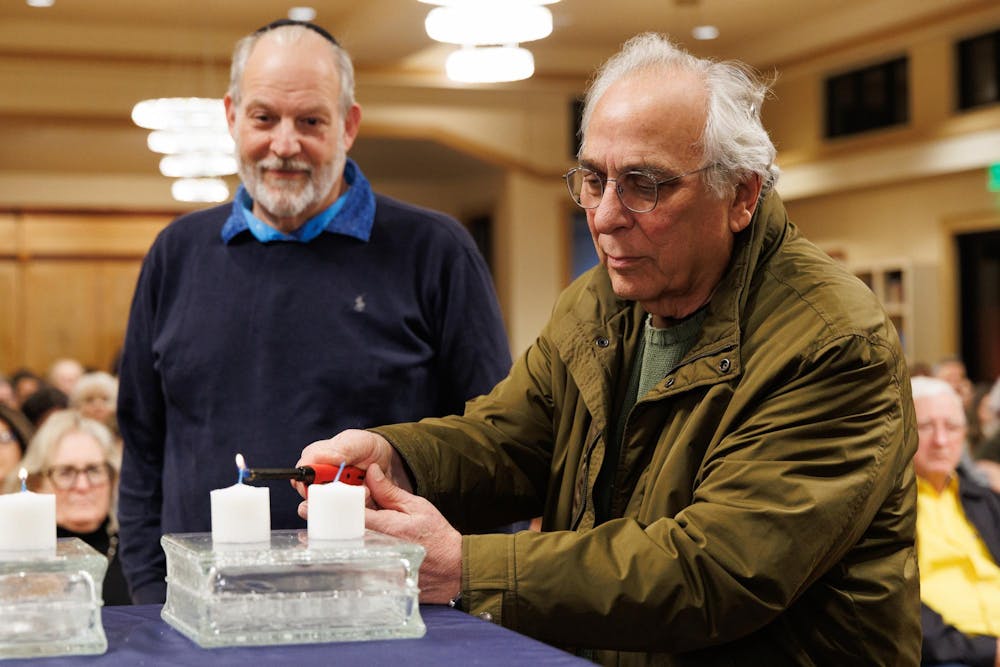 Dr. Marvin Slott lights a candle at an International Holocaust Remembrance Day event at the Chabad UF Jewish Center in Gainesville, Fla., Wednesday, Jan. 21, 2026.