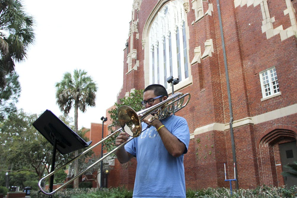 Xavier Gonzalez, a 26-year-old UF performance graduate student, practices bass trombone in front of the University Auditorium on Monday afternoon. Gonzalez said the practice rooms in the Music Building had been too warm to play in lately.