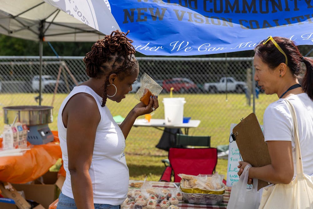 President of the Waldo Community New Vision Coalition Julie Stokes describes her sweet potato themed treats at the Waldo Sweet Potato Festival & Car Display in Waldo, Florida, on Saturday, Sept. 13, 2025.