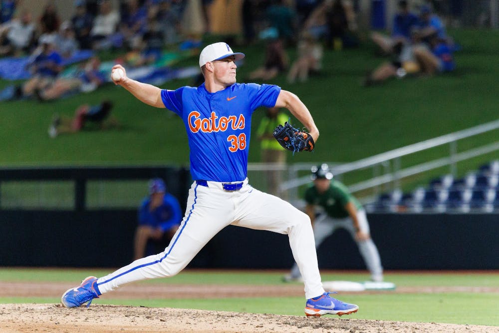 Florida right-handed pitcher Cooper Walls (38) throws a pitch during an NCAA baseball game against Jacksonville University, Tuesday, March 31, 2026, in Gainesville, Fla.