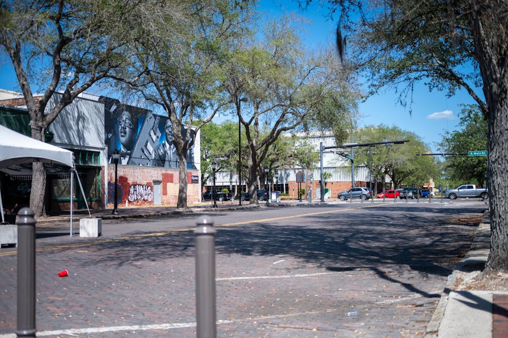 The north block of SW 1st Avenue in Gainesville, Fla., is already a pedestrian street, with businesses like The Bull having access to the entire street to use for seating and other purposes, Friday, April 17, 2026.