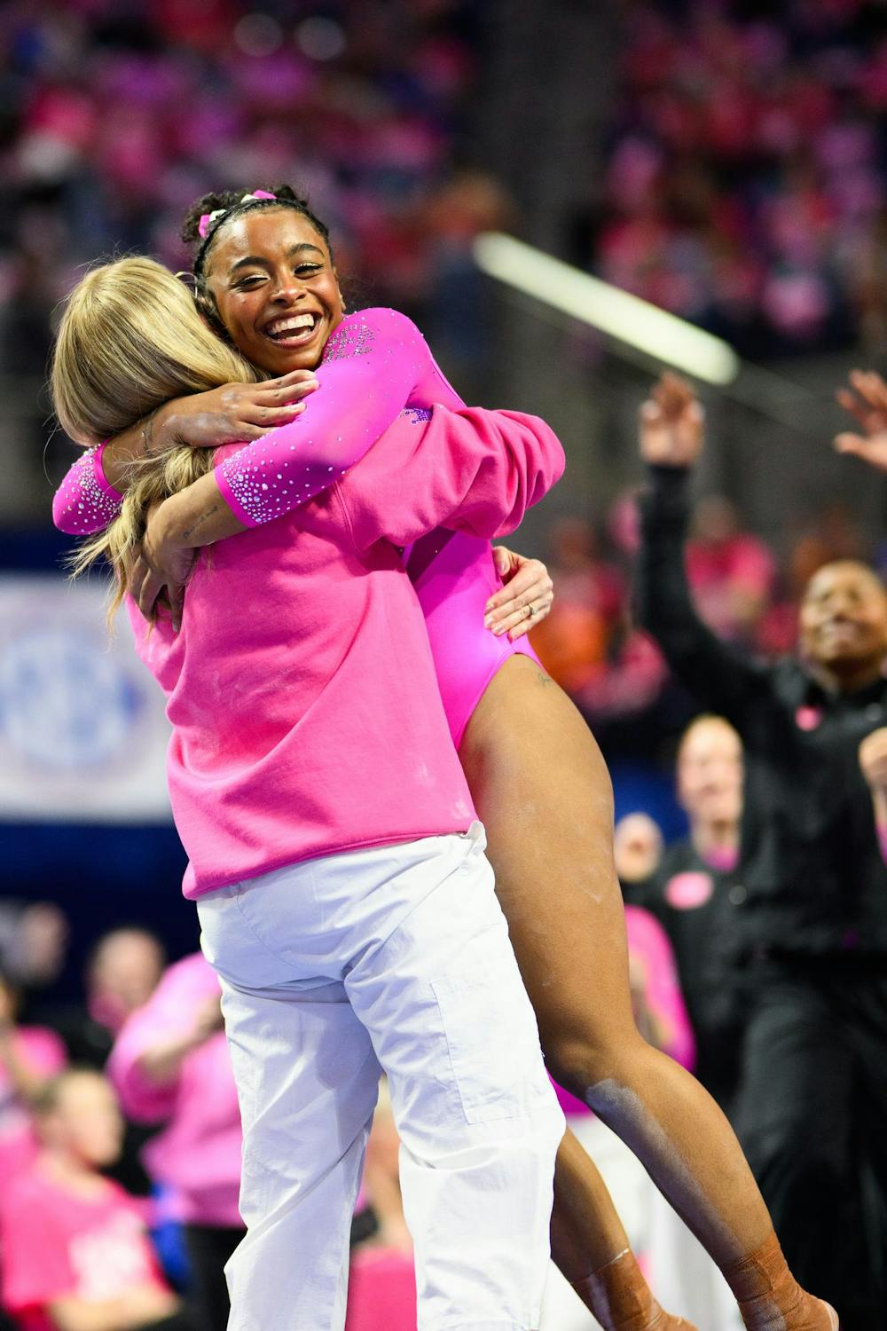 Florida gymnast Selena Harris-Miranda celebrates with head coach Jenny Rowland after a performance on the beam during an NCAA gymnastics meet against Oklahoma, Friday, Feb. 13, 2026, in Gainesville, Fla.