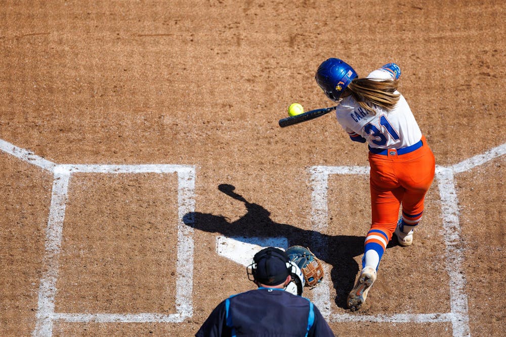Florida Gators infielder Kenleigh Cahalan hits a home run during an NCAA softball game against MTSU, Sunday, Feb. 22, 2026, in Gainesville, Fla.