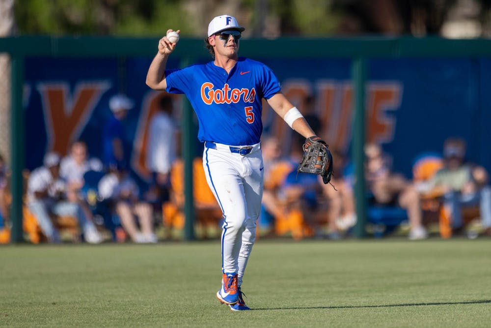 Florida outfielder Blake Cyr (5) throws the ball during an NCAA college baseball game against Auburn at Condron Family Ballpark in Gainesville, Fla., Friday, April 17, 2026.