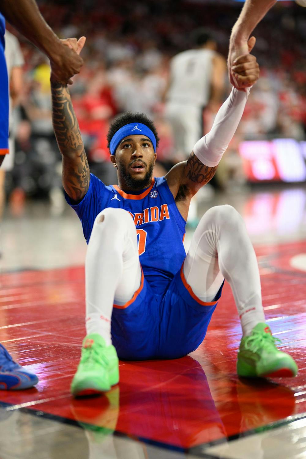 Florida guard Boogie Fland (0) is helped up by teammates during the first half of an NCAA college basketball gme against Georgia, Wednesday, Feb. 11, 2026, in Athens, Ga.