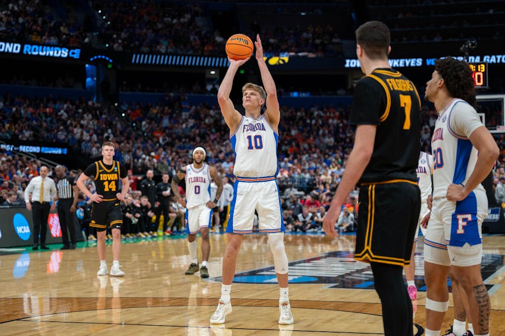 Florida forward Thomas Haugh (10) shoots a free throw during the second half of an NCAA Tournament second round game against Iowa, Saturday, March 22, 2026, in Tampa, Fla.