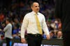 Florida head coach Todd Golden rushes a huddle during the first half of an NCAA Tournament second round game against Iowa, Sunday, March 22, 2026, in Tampa, Fla.