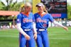 Florida right-handed pitcher Caroline Stanton (1) and outfielder Taylor Shumaker (21) laugh before an NCAA softball game against Mississippi State, Saturday, April 4, 2026, in Gainesville, Fla.