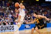 Florida guard Boogie Fland (0) dribbles during the first half of an NCAA Tournament second round game against Iowa, Sunday, March 22, 2026, in Tampa, Fla.