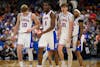 Florida stands on the court during the first half of an NCAA Tournament second round game against Iowa, Sunday, March 22, 2026, in Tampa, Fla.