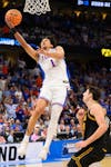 Florida guard Xaivian Lee (1) shoots a layup during the first half of an NCAA Tournament second round game against Iowa, Sunday, March 22, 2026, in Tampa, Fla.