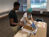 Reginald Carrol, 16, is instructed on the printmaking process by Harn volunteer Juana Diaz, 20. Diaz is a printmaking major at UF, and Carroll, who also performed a poem at the event, is a sophomore printmat Eastside High School.