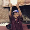 Declan Patrick, a three-year-old UF Health Shands patient, holds up his honorary bid card to UF Pi Kappa Alpha. The fraternity gave Declan a basketball and football signed by all the fraternity brothers.