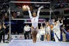 Florida gymnast eMjae Frazier competes on the bars during an NCAA gymnastics meet against Alabama in Gainesville, Fla., Friday, Jan. 16, 2026.
