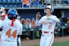 Florida right-handed pitcher Ava Brown (00) celebrates during an NCAA softball game against Lindenwood, Saturday, Feb. 21, 2026, in Gainesville, Fla.