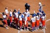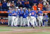 The Florida Gators softball team greets Florida Gators infielder Kenleigh Cahalan at home plate after a home run during an NCAA softball game against MTSU, Sunday, Feb. 22, 2026, in Gainesville, Fla.