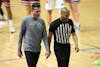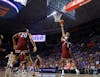 Florida guard Laila Reynolds (13) and guard Liv McGill (23) talk with Florida head coach Kelly Rae Finley during the third quarter of an NCAA basketball game against Alabama, Sunday, Feb.22, 2026, in Gainesville, Fla.