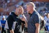 Florida Gators head coach Billy Napier patrols the field during pregame warmups at Darrell K Royal Memorial Stadium on Saturday, November 9, 2024.