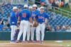 Florida head coach Kevin O’Sullivan stands at the mound for a pitching change during an NCAA baseball game against Jacksonville University, Tuesday, March 31, 2026, in Gainesville, Fla.