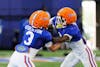 Florida Gators wide reciever Bailey Stockton and Florida Gators wide reciever Vernell Brown III take part in a blocking drill during a spring practice, Thursday, April 2, 2026, in Gainesville, Fla.