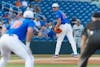 Florida left-handed pitcher Eli Blair (34) throws a pitch during an NCAA baseball game against Jacksonville University, Tuesday, March 31, 2026, in Gainesville, Fla.
