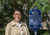 Eva Siomara Sosa stands on the Plaza of the Americas in front of the Latin American studies display Thursday, Oct. 23, 2025.