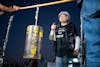 Helen Pajama, protester in opposition of Bryan Frederick Jennings’ execution, bangs a hammer on a metal cylinder in solidarity. Jennings was executed in Raiford on Thursday, Nov. 13, 2025.