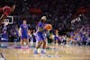 Florida Gators guard Boogie Fland (0) has struggled to shoot the ball beyond the arc, missing a mid range shot during the first half of a NCAA college basketball game against North Florida, Thursday, Nov. 06, 2025, in Gainesville, Fla.
