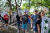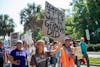 Protestors march down Depot Avenue, Saturday, March 28, 2026, in Gainesville, Fla.