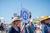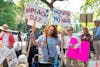 Protestors dance and hold signs at Cora Robertson Park, Saturday, March 28, 2026, in Gainesville, Fla.