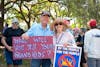 Protesters hold signs and chant at Depot Park, Saturday, March 28, 2026, in Gainesville, Fla.
