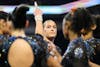 Florida gymnast Selena Harris-Miranda holds a team huddle during the NCAA gymnastics National Championship against Oklahoma, LSU and Minnesota, Saturday, April 18, 2026, in Fort Worth, Texas.