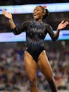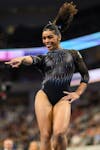 Florida gymnast eMjae Frazier performs on the floor during the NCAA gymnastics National Championship against Oklahoma, LSU and Minnesota, Saturday, April 18, 2026, in Fort Worth, Texas.