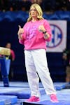 Florida head coach Jenny Rowland watches her team before the beam during an NCAA gymnastics meet against Oklahoma, Friday, Feb. 13, 2026, in Gainesville, Fla.