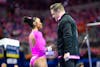 Florida gymnast Selena Harris-Miranda talks with her coach before her performance on the bars during an NCAA gymnastics meet against Oklahoma, Friday, Feb. 13, 2026, in Gainesville, Fla.
