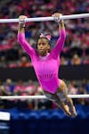 Florida gymnast eMjae Frazier performs on the bars during an NCAA gymnastics meet against Oklahoma, Friday, Feb. 13, 2026, in Gainesville, Fla.