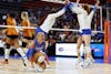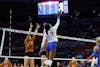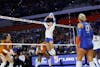 Florida Gators outside hitter Jordyn Byrd (14) jumps towards the net during a NCAA Volleyball match on Friday, November 07, 2025.