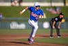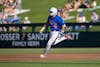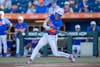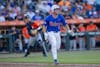 Florida outfielder Kyle Jones (3) drops his bat and runs to first base during an NCAA college baseball game against Auburn at Condron Family Ballpark in Gainesville, Fla., Friday, April 17, 2026.