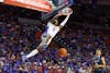 Florida Gators guard Boogie Fland (0) dunks during the first half of a NCAA college basketball game against North Florida, Thursday, Nov. 06, 2025, in Gainesville, Fla.