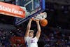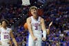 Florida Gators forward Thomas Haugh (10) lays the ball towards the basket during the first half of a NCAA college basketball game against North Florida, Thursday, Nov. 06, 2025, in Gainesville, Fla.