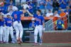 Florida infielder Blake Cyr (5) runs home during an NCAA college baseball game against Auburn at Condron Family Ballpark in Gainesville, Fla., Friday, April 17, 2026.