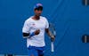 Florida’s Adhithya Ganesan celebrates in a NCAA men's singles tennis match against Oklahoma, Sunday, March 29, 2026, in Gainesville, Fla.