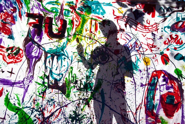 UF student Nicholas Cravey is silhouetted through a sheet he is painting on the Plaza of the Americas Tuesday afternoon.