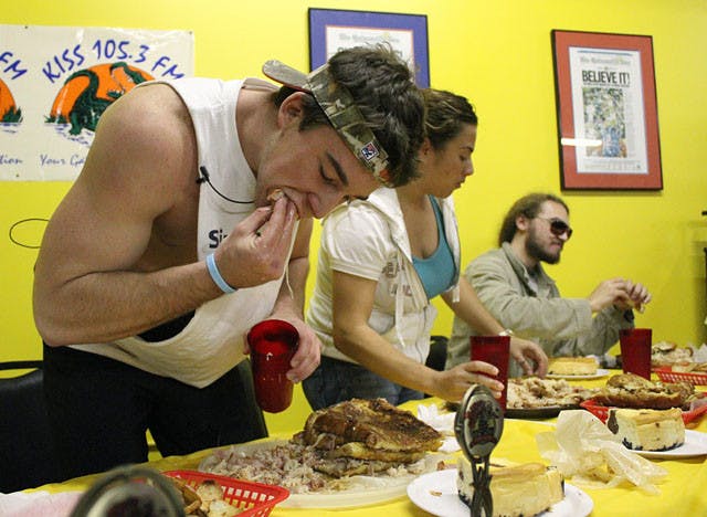 Five contestants scarfed down 7 pounds of food Thursday night for a promotional event at Jeff’s New York Deli.