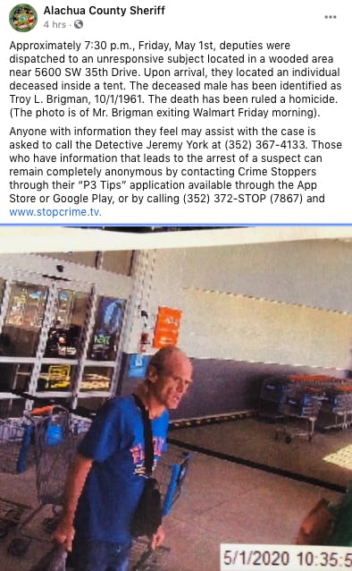 The Alachua County Sheriff’s Office found the body of Troy L. Brigman in a tent Friday evening. Brigman was seen exiting a Walmart nine hours prior.